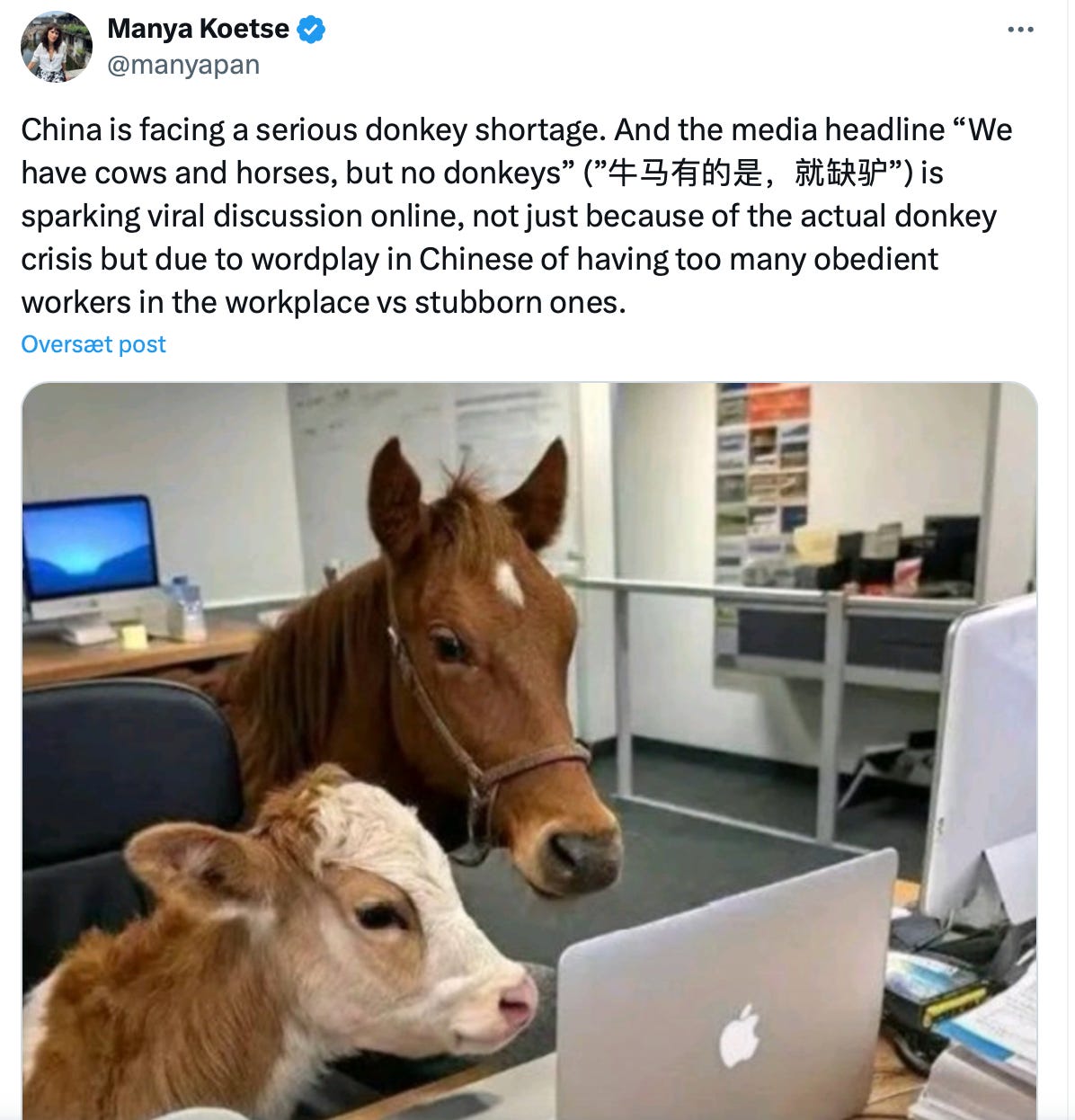 Historien om æselmangel gik pludselig viralt i Kina, hvor den fik sit eget liv som metafor for personligheder på arbejdspladsen.
