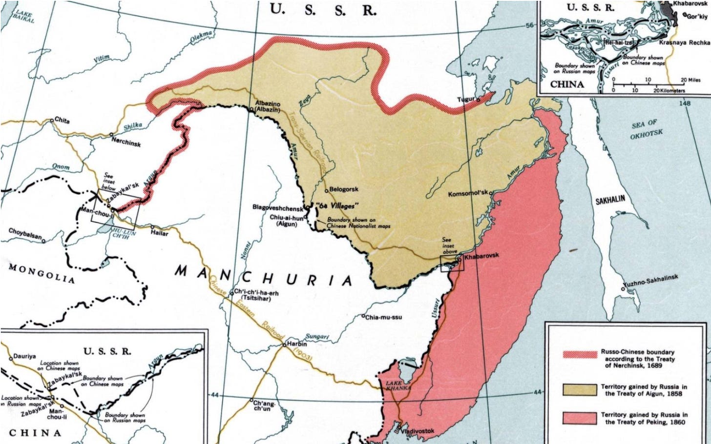 Kontekst: Under Taiping opstanden udnyttede det russiske imperium kaosset til at invadere og annektere Det Ydre Manchuriet 外满洲, et territorium i Nordøstasien, der arealmæssigt er større end Frankrig. Kontrollen over området blev afstået til Tsar-Rusland af Qing-Dynastiet under Amur-annekteringen i Aigun-traktaten i 1858 og Peking-traktaten i 1860.