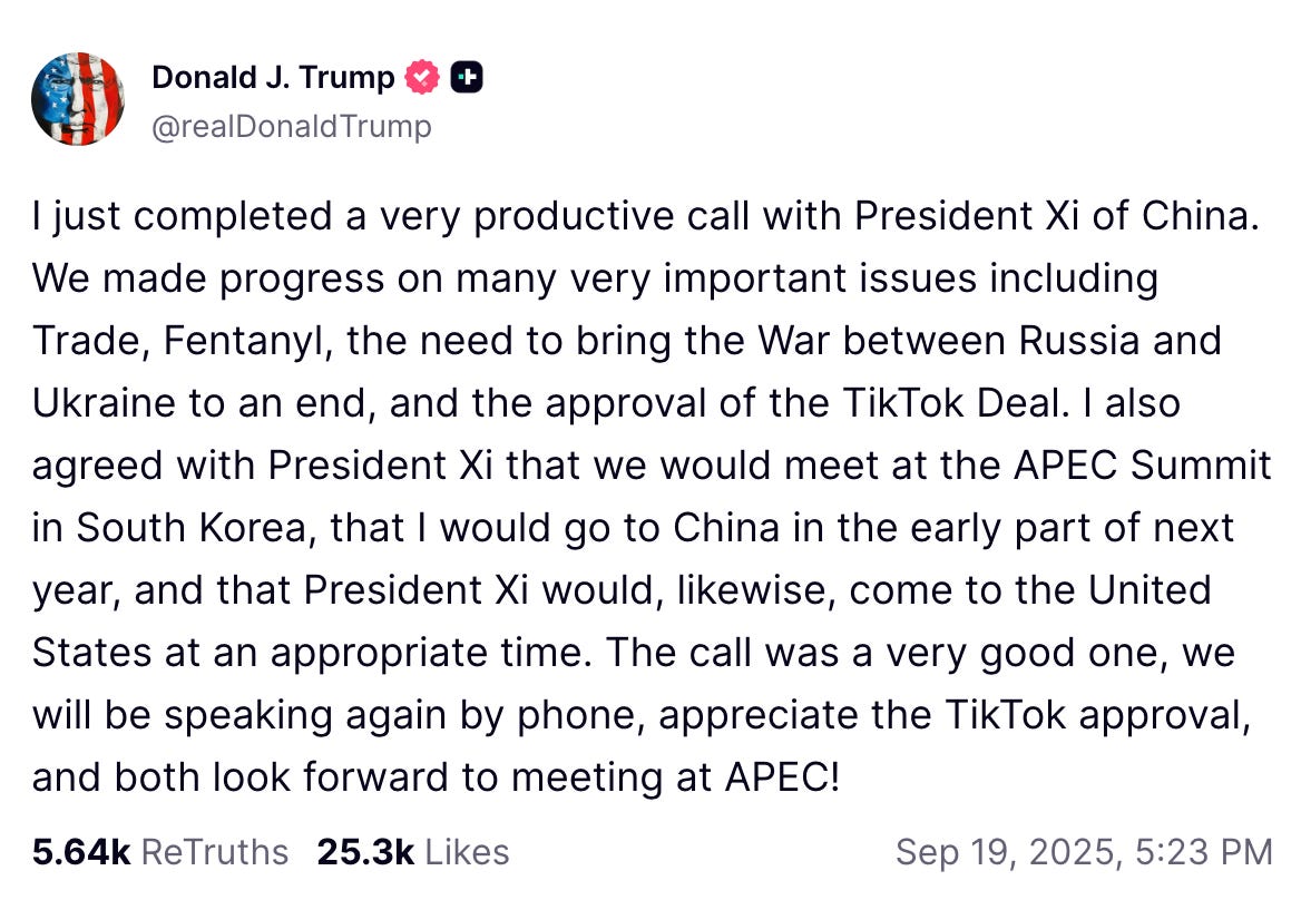 Kontekst: September har budt på mange officielle samtaler mellem Kina og USA: Forsvarsminister Peter Hegseth har talt med den kinesiske ditto, Dong Jun 董军, den kinesiske udenrigsminister, Wang Yi 王毅 har talt med sin amerikanske kollega, Marco Rubio, og finansminister Scott Bessent havde et vigtigt møde med en kinesisk delegation i Madrid, anført af vicepremierminister og chefforhandler i handelsspørgsmål, He Lifeng 何立峰, hvor rammerne for et salg af Tiktok blev diskuteret. Og så endelig talte Donald Trump i telefon med præsident Xi Jinping i fredags.