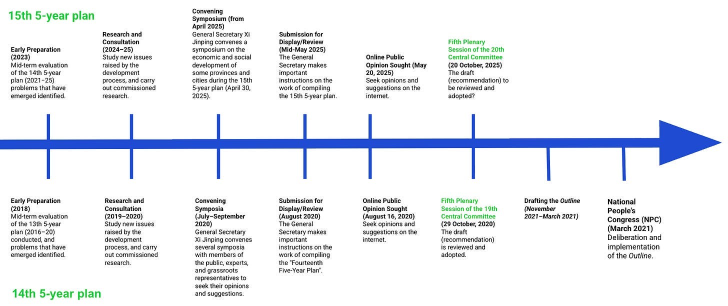 Kommentar: Udfærdigelsen af Femårsplanen attribueres normalt den magtfulde Nationale Udviklings- og Reform Komite 发改委 (NDRC), der er Kinas centrale planlægningsorgan, men får desuden mange input fra universiteter, forskningsinstitutioner m.fl. Under NDRC har Departementet for Udviklingsstrategi og Planlægning en nøglerolle og udstedte i forbindelse med den kommende 15. femårsplan i alt 74 forskningsspørgsmål, hvoraf 65 blev tildelt specifikke forskerhold.