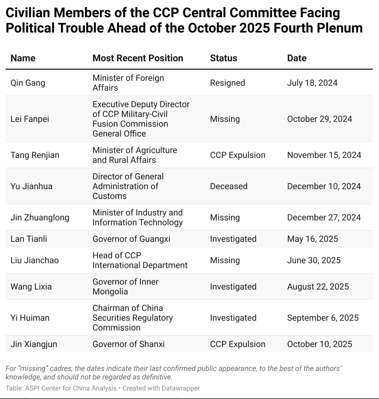De udrensede eller tilbagetrådte personer talte udover militære positioner også mange folk, der besad myndigheds- og civile poster. Omfanget af medlemmer af centralkomiteen, der enten er trådt tilbage fra deres post eller er under efterforskning for korruption siden den 20. Partikongres i 2022 er det højeste i flere årtier. Blot 168 ud af 205 medlemmerne, eller omkring 82 pct., deltog i det 4. plenarmøde.