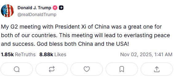 Xi kan dog være tilfreds, da han tilsyneladende er lykkedes med at få Trump til at se ham og Kina som ligeværdige stormagter. På sit eget sociale medie Truth Social omtalte den amerikanske præsident Kina og USA som G2, hvilket skaber stor bekymring hos mange.