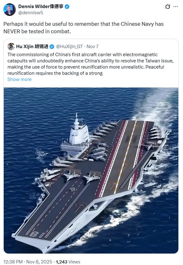 Man kan håbe, som Mark Parker Young også påpeger, at Xis store udrensninger betyder, at Kinas leder ikke regner med, at militæret skal ud i nogen konflikt lige foreløbig. Trods rygterne om, at hans ønske om, at militæret skal være i stand til at tage Taiwan med magt i 2027 også betyder, at de vil gøre det. Dennis Wilder, senior fellow of Georgetown’s Initiative for US-China Dialogue on Global Issues, og fhv. CIA-mand, påpegede i forbindelse med idriftsættelsen af Kinas nyeste, største og potentielt mest kapable hangarskib, Fuijian, at den kinesiske flåde aldrig er blevet testet i reel kamp: