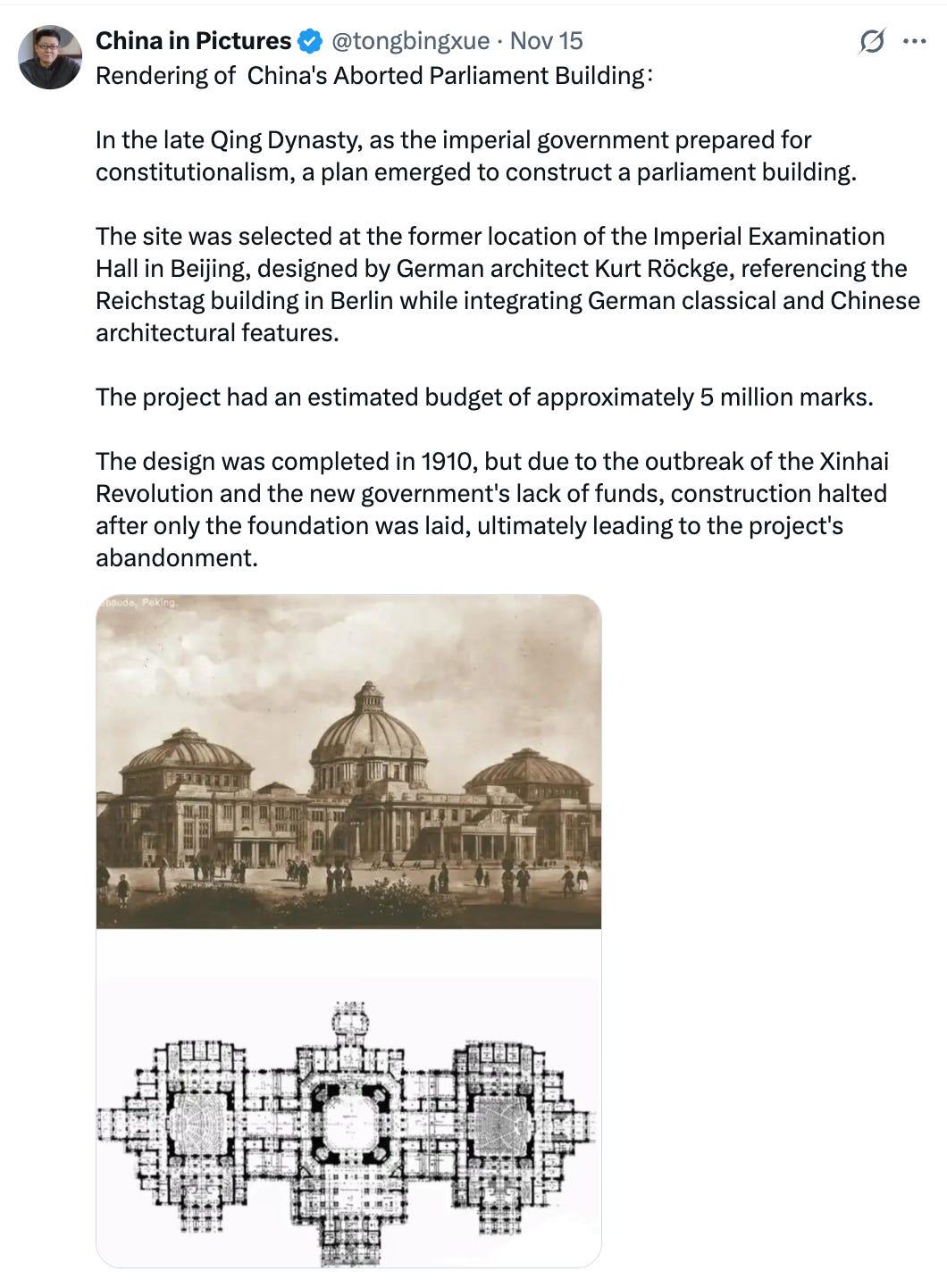 Sådan kunne Kinas parlamentsbygning have set ud, da Qing-dynastiet i slutningen af dets levetid planlagde at overgå til konstitutionalisme. Sådan gik det som bekendt ikke, og man må sige, at bygningen er en noget anden stil end Folkets Store Hal.
