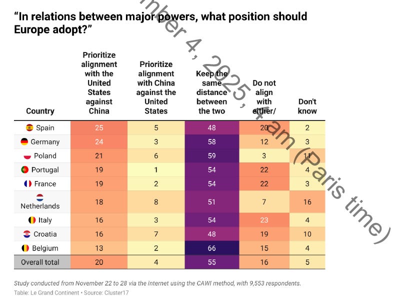 Ikke desto mindre melder Séjourné ud, at hvis ikke handlingsplanen opnår de ønskede resultater, må man berede sig på at affyre den berygtede, men dog endnu uafprøvede, ‘handelsbazooka’, nemlig instrumentet til bekæmpelse af økonomisk tvang (“Anti-Coercion Instrument”). I en tid, hvor en større del af den europæiske befolkning mener, at EU skal distancere sig lige så langt væk fra USA som fra Kina (se nedestående), er det ikke så bemærkelsesværdigt, at formålet med de forskellige de-risking-tiltag både har øst og vest i sigte. (Selvom nogle vil mene, at handelsbazookaens inaktivitet i kølvandet på ‘liberation day’ i april og godtagelsen af “handelsaftalen” med Donald Trump i juli kan synes at indikere andet for Europas strategiske autonomi).
