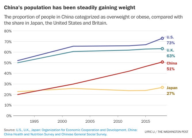 Læs tebladene: Set i lyset af flere sultkatastrofer i Kinas historie anses et par ekstra kilo på sidebenene som et positivt statussymbol blandt en ikke ubetydelig del af befolkningen i landet. Af den årsag iværksatte de kinesiske sundhedsmyndigheder, National Health Commission 中华人民共和国国家卫生健康委员会 (zhōng huá rén mín gòng hé guó guó jiā wèi shēng jiàn kāng wěi yuán huì), i 2024 en 3-årig kampagne for at tage hånd om problemet og systematisk ændre på forståelsen af overvægt. Det har imidlertid - i vanlig Kina-stil - ført til en række opfindsomme kampagner på lokalt niveau. Et eksempel er byen Wuxi i Jiangsu-provinsen, hvor myndighederne i Liangxi-distriktet tilbød et kilo oksekød for hvert kilo, borgerne tabte.