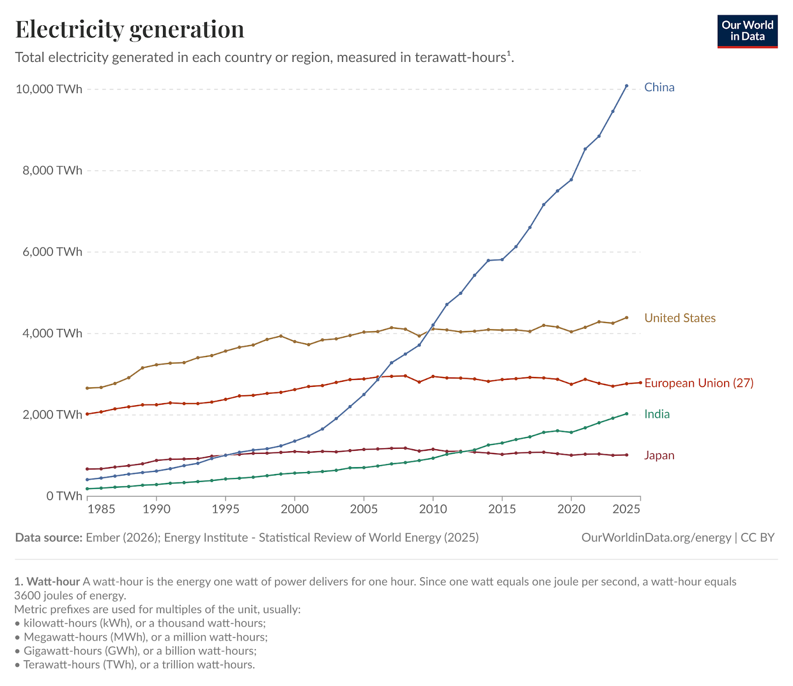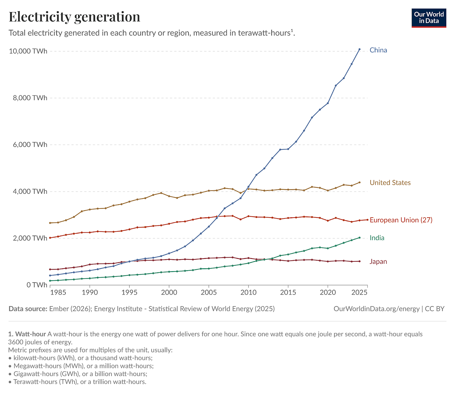 Kontekst: The Economist kigger på, hvordan billig energi styrker potentialet inden for kunstig intelligens (AI). Kina producerer nemlig næsten lige så meget energi som USA, EU, Indien og Japan gør tilsammen - og det kan få afgørende betydning for kapløbet om kunstig intelligens.
